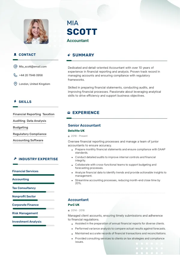 - Your resume will highlight your expertise in financial reporting, tax compliance, and auditing, which are crucial for Accountants in the United Kingdom.