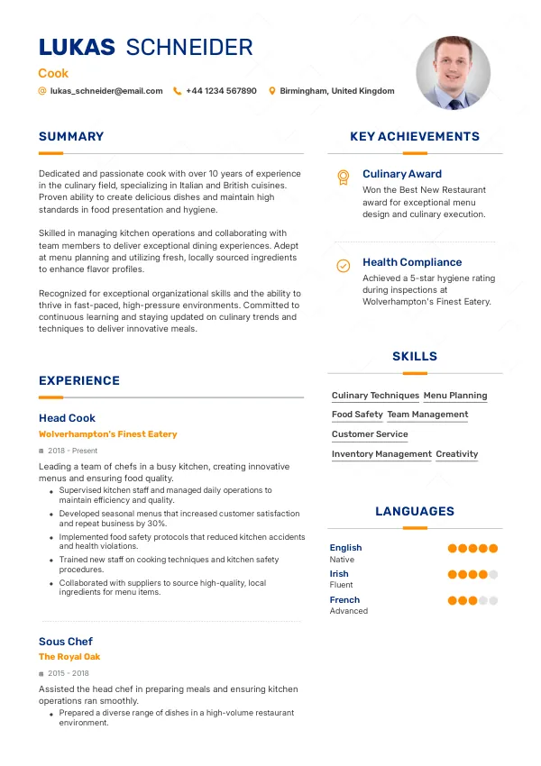 - As a Cook in the United Kingdom, your resume should emphasize your ability to work under pressure and your experience with diverse cuisines.