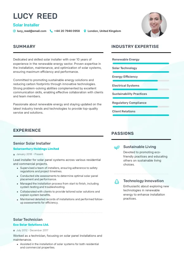- As a Solar Installer in the United Kingdom, your resume should highlight your experience with installation techniques and compliance with UK energy regulations.