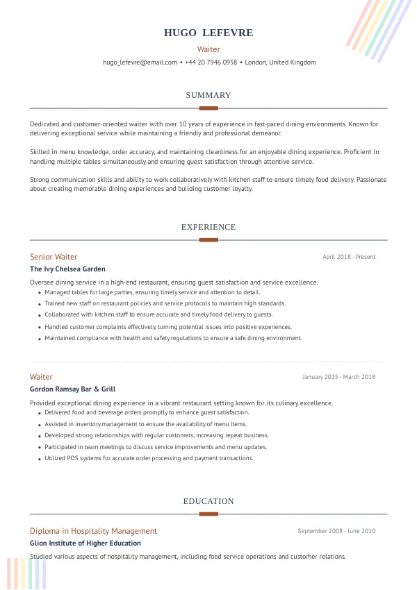 As a Waiter or Waitress in the United Kingdom, your resume needs to showcase not just your experience but also your ability to thrive in a competitive hospitality market. With a high demand for skilled staff, it's essential to stand out.